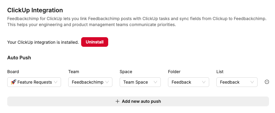 Configure Auto Push rules to automatically create tasks in ClickUp when a new post is added in FeedbackChimp. Minimize manual work and make sure every critical piece of feedback gets the attention it deserves.