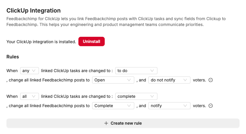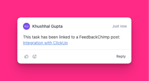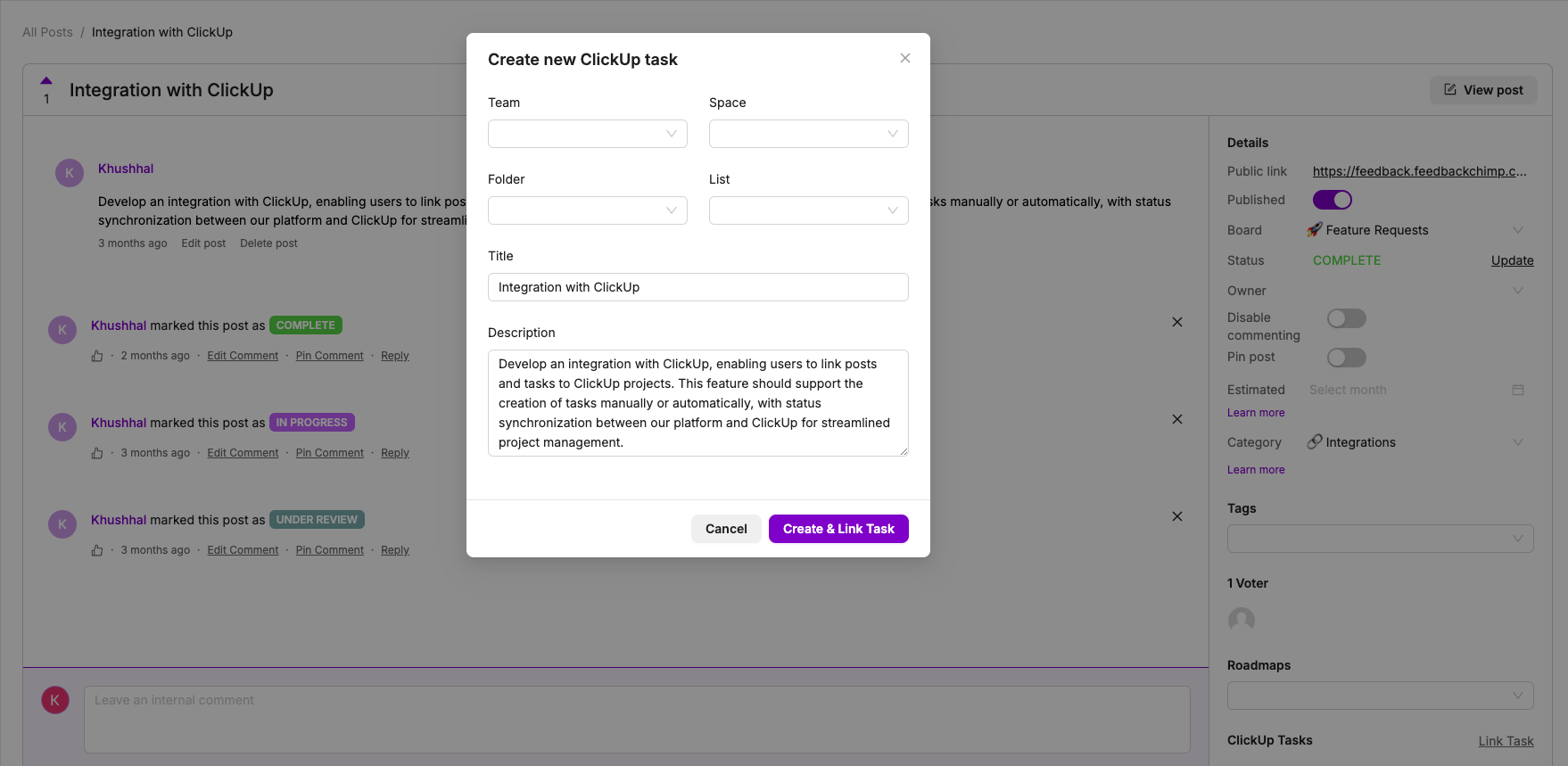 Push tasks from FeedbackChimp to ClickUp and keep them linked. Reference feedback posts directly within ClickUp, ensuring that no valuable insight is missed during task execution.