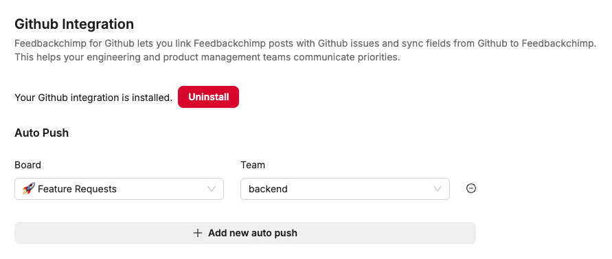 Push feedback posts from FeedbackChimp to GitHub issues, keep statuses in sync, and automate issue creation with Auto Push rules.
