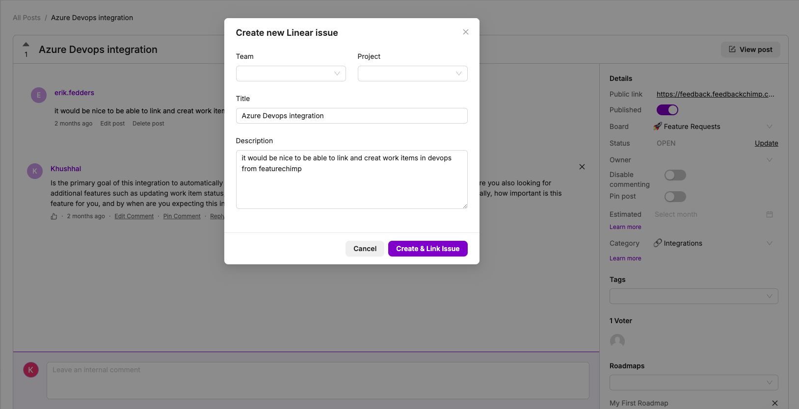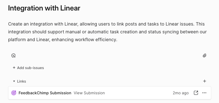 Access linked FeedbackChimp posts directly within your Linear issues. Keep track of customer feedback alongside your project details for a better context when making product decisions.
