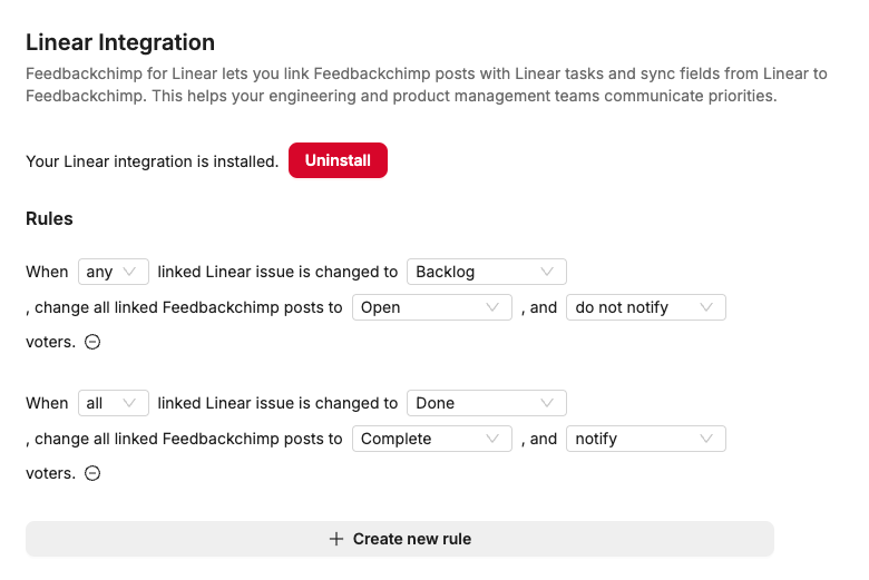 Automatically sync status changes between Linear and FeedbackChimp. Ensure your whole team is always up to date without needing to update multiple platforms manually.