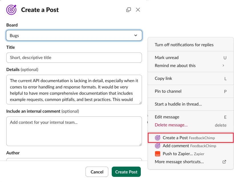 Convert important conversations into actionable insights. Use Slack’s message menu to create a new comment or feedback post directly from any Slack message, ensuring every useful idea is captured.