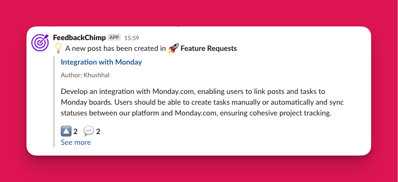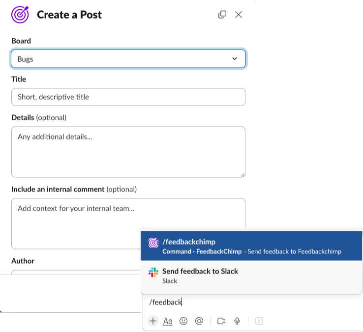 Receive new feedback, ideas, and updates directly in Slack. Use the /feedbackchimp command to easily submit feedback and feature requests straight from Slack conversations.