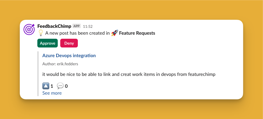 Easily approve or deny feedback posts as soon as they come in—all without leaving Slack. Streamline feedback management and keep your feedback board curated and focused.